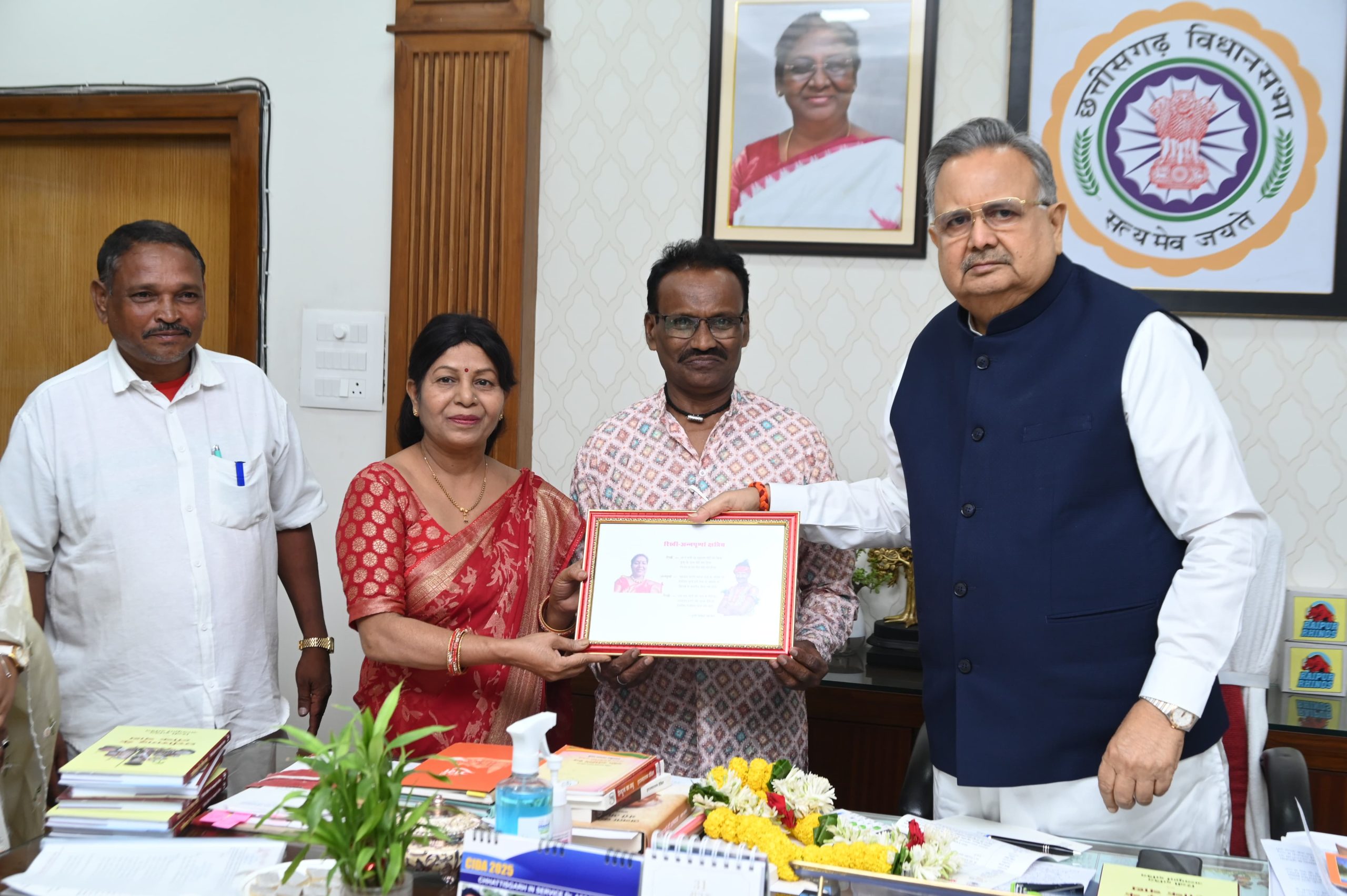 ‘छत्तीसगढ़ के लोकवाद्य’ किताब के विमोचन के अवसर पर लेखक दंपति रिखी क्षत्रिय-अन्नपूर्णा क्षत्रिय के साथ साहित्य अकादमी छत्तीसगढ़ के अध्यक्ष शशांक शर्मा, डॉ. शशिप्रिया उपाध्याय,अभिषेक उपाध्याय और लेखक दुर्गा प्रसाद पारकर सहित अन्य लोग मौजूद थे।