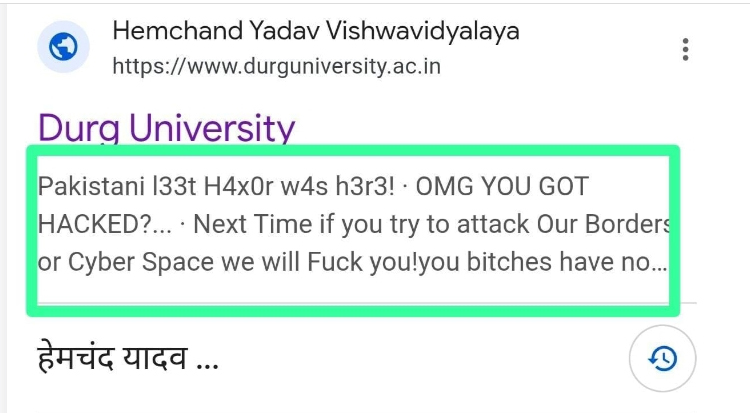 दुर्ग। दुर्ग के हेमचंद यादव विश्वविद्यालय की आधिकारिक वेबसाइट को कल देर रात अज्ञात हैकर्स ने हैक कर लिया और कुछ समय के लिए अंग्रेजी में अपशब्दों भरा एक मैसेज भी दिखाई दिया। इस मैसेज में धमकी दी गई थी कि अगली बार अगर तुमने हमारी सीमाओं या साइबर स्पेस पर हमला करने की कोशिश की, तो हम तुम्हें ऐसी… (अपशब्द) का प्रयोग किया गया। हालांकि कुछ ही देर में वेबसाइट सामान्य स्थिति में आ गई। हेमचंद यूनिवर्सिटी के रजिस्ट्रार भूपेंद्र कुलदीप ने बताया कि वेबसाइट हैंग हो गया था। हमने शटडाउन करके उसे तुरंत 15 मिनट के अंदर रिस्टोर कर लिया है।