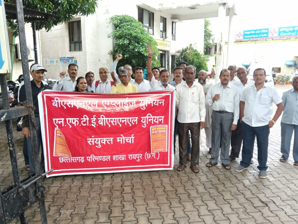 रायपुर। ऑल इंडिया ट्रेड यूनियन क्या वहां पर 23 सूत्रीय मांगों के लिए राष्ट्रव्यापी आंदोलन प्रदर्शन मशाल रैली का आयोजन आज 9 जुलाई को पूरे देश में किया गया है। इसी परिप्रेक्ष्य में रायपुर राजधानी के फाफाडीह चौक स्थित टेलीफोन एक्सचेंज में प्रातः 10:30 बजे से बीएसएनएल हड़ताल पर रहे तथा जंगी नारेबाजी, प्रदर्शन कर केंद्र सरकार की कर्मचारी मजदूर विरोधी नीतियों का विरोध करते हुए अपने वेतनमान के लिए हड़ताल पर रहे। कर्मचारी नेता विजय कुमार झा ने बताया है कि रायपुर ट्रेड यूनियन काउंसिल के आह्वाहन पर बीमा, बैंक,राज्य सरकार के कर्मचारी,रेल्वे, पेंशनर्स आदि के नेता एवं सदस्य इस प्रदर्शन में शामिल हुए। ट्रेड यूनियन के संयोजक एचपी साहू, सह संयोजक सुधाकर चीलमवार, बैंक यूनियन के अध्यक्ष शिरीश नलगुंडवार,स्टेट प्रदेश शासकीय कर्मचारी संघ के पेंशनर्स यूनियन के संरक्षक विजय कुमार झा, कमलेश संगोड़े, एम एल गभेल, सतीष मेश्राम, साथी लुईस आदि ने अपने संबोधन में तीसरे वेतनमान की मांग सहित कर्मचारी,पेंशनर, मजदूर, श्रमिक इस प्रदर्शन में बड़ी संख्या में भाग लिए। पेंशन बंद करने की साजिश, बेरोजगारी, संविधान से छेड़छाड़, श्रमिकों के लिए नया कानून बनाकर शोषण करने, 8 घंटा श्रम कानून के अंतर्गत कार्य करने, महिलाओं का उत्पीड़न, कर्मचारियों को प्रताड़ित करने, जैसे विभिन्न मांगों के लिए आज बीएसएनएल कर्मचारी जंगी प्रदर्शन कर हड़ताल पर रहे।