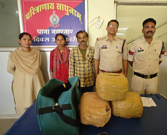जगदलपुर। जिले के थाना नगरनार पुलिस को जरिये मुखबीर सूचना मिला कि एक महिला एवं एक पुरूष अपने कब्जे के बैग में अवैध मादक पदार्थ गांजा रखकर ग्राम धनपुंजी फारेस्ट नाका के पास जगदलपुर की ओर जाने वाले बस का इंतजार कर रहे है। सुचना पर रविवार दाेपहर में हमराह पुलिस टीम महिला स्टाप के साथ ग्राम धनपुंजी फारेस्ट नाका एनएच. 63 के पास पहुंचकर देखे मुखबीर के बताये अनुसार एक महिला एवं एक पुरुष रोड किनारे बस का इंतजार करते हुये मिले। जिसे घेराबंदी कर पकडकर पुरूष व्यक्ति से नाम पता पूछने पर अपना नाम विजय सिंह ठाकुर पिता स्वराज सिंह ठाकुर एवं महिला ने अपना नाम संजना सिंह ठाकुर पति विजय सिंह ठाकुर दाेनाे निवासी दमूनाका पंजाब बैंक कालोनी जबलपुर मध्यप्रदेश बताये आरोपियों के अधिपत्य के बैग का तलाशी लेने पर 3 पैकेट सेलोटेप से लिपटा हुआ अवैध मादक पदार्थ गांजा कुल वजन 11.505 किग्रा. एवं एक नग मोबाईल को बरामद कर जप्त किया गया। आरोपीयों का कृत्य अपराध धारा 20 (ख) एनडीपीएस एक्ट का पाये जाने से आरोपियों को गिरफ्तार कर अपराध सदर कायम कर विवेचना में लिया गया। संपूर्ण कार्यवाही में निरीक्षक संतोष सिंह, उनि सतीस यदुराज, सउनि सतीस तिवारी, प्रधान आरक्षक विकास सिंह, रमेश पासवान, धरम कश्यप, म.प्र.आर. पीलेश्वरी साहु महिला आरक्षक थानेश्वरी कश्यप आरक्षक दशरू नाग का योगदान रहा ।