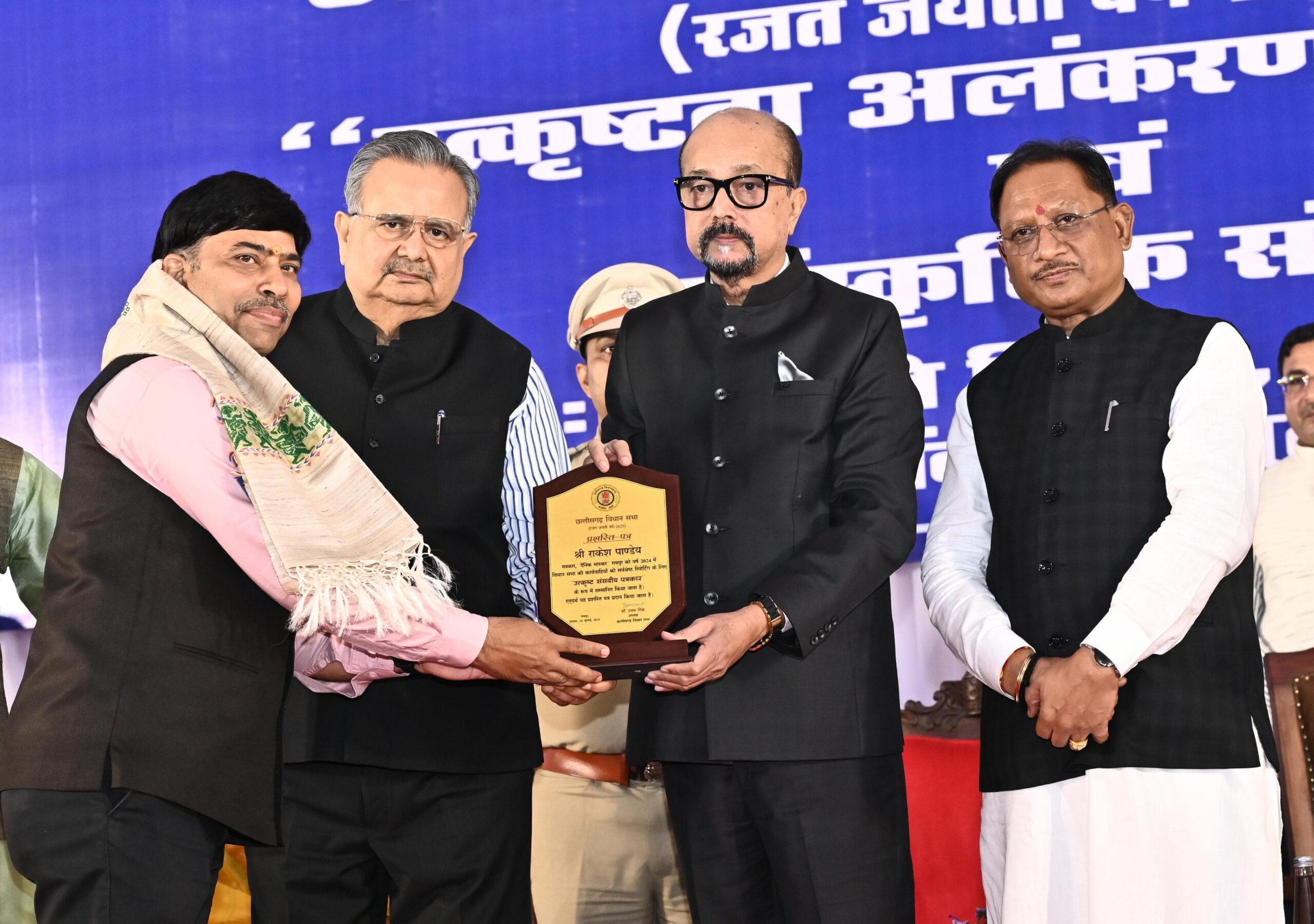 रायपुर। राज्यपाल श्री रमेन डेका के मुख्य आतिथ्य में आज छत्तीसगढ़ विधानसभा परिसर में आयोजित “उत्कृष्टता अलंकरण समारोह” गरिमामय वातावरण में संपन्न हुआ। विधानसभा अध्यक्ष डॉ. रमन सिंह ने समारोह की अध्यक्षता की। मुख्यमंत्री श्री विष्णु देव साय और नेता प्रतिपक्ष डॉ. चरणदास महंत विशिष्ट अतिथि के रूप में समारोह में शामिल हुए। “उत्कृष्टता अलंकरण समारोह” में वर्ष-2024 के लिए श्रीमती भावना वोहरा और श्री लखेश्वर बघेल को उत्कृष्ट विधायक के रूप में सम्मानित किया गया। उत्कृष्ट संसदीय रिपोर्टिंग के लिए दैनिक भास्कर के विशेष संवाददाता डॉ. राकेश कुमार पाण्डेय, सुदर्शन न्यूज़ चैनल के राज्य ब्यूरो प्रमुख श्री योगेश मिश्रा और सुदर्शन न्यूज़ के कैमरामेन श्री विश्वप्रकाश पुरेना को समारोह में सम्मानित किया गया।