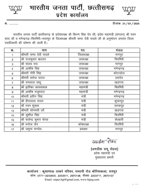 रायपुर। भारतीय जनता पार्टी छत्तीसगढ़ के प्रदेशाध्यक्ष किरण सिंह देव, प्रदेश महामंत्री (संगठन) पवन साय व मनेन्द्रगढ़-चिरमिरी-भरतपुर के जिलाध्यक्ष श्रीमती चम्पा देवी पावले के अनुमोदन उपरांत जिला पदाधिकारी की घोषणा की गई।