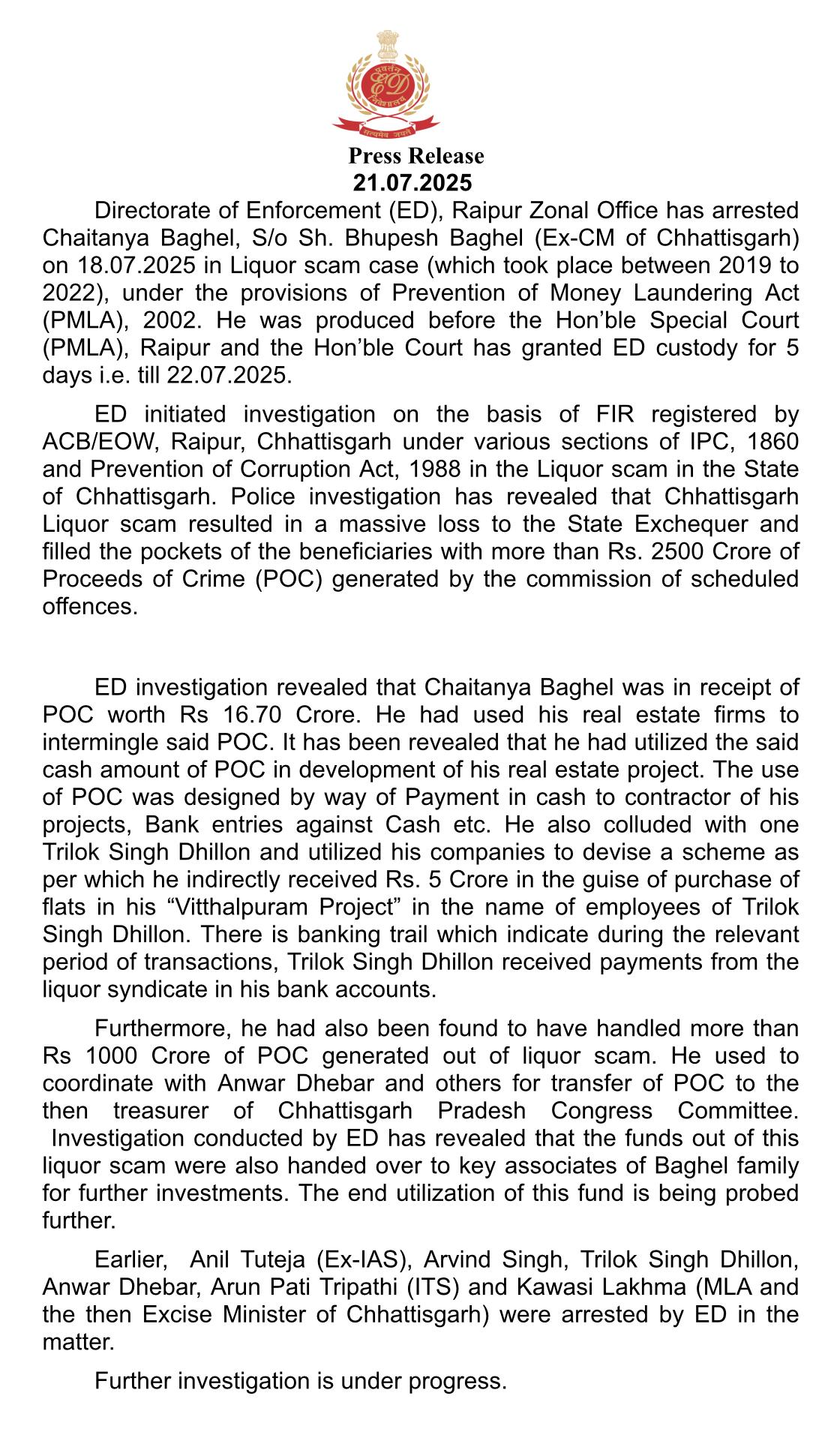 रायपुर।  राज्य के शराब घोटाला कांड में ईडी ने सोमवार को  जहां कुछ अन्य लोगों को गिरफ्तार किया वहीं दूसरी ओर इस मामले में गिरफ्तार किये गये पूर्व मुख्यमंत्री  भूपेश बघेल के पुत्र चैतन्य बघेल की संलिप्तता जाहिर करते हुए  बताया कि चैतन्य ने 16.70 करोड लिये थे। चैतन्य इस समय ईडी की रिमांड पर है कल याने मंगलवार की दोपहर में उसे ईडी उसे न्यायालय में पेश करेगी।