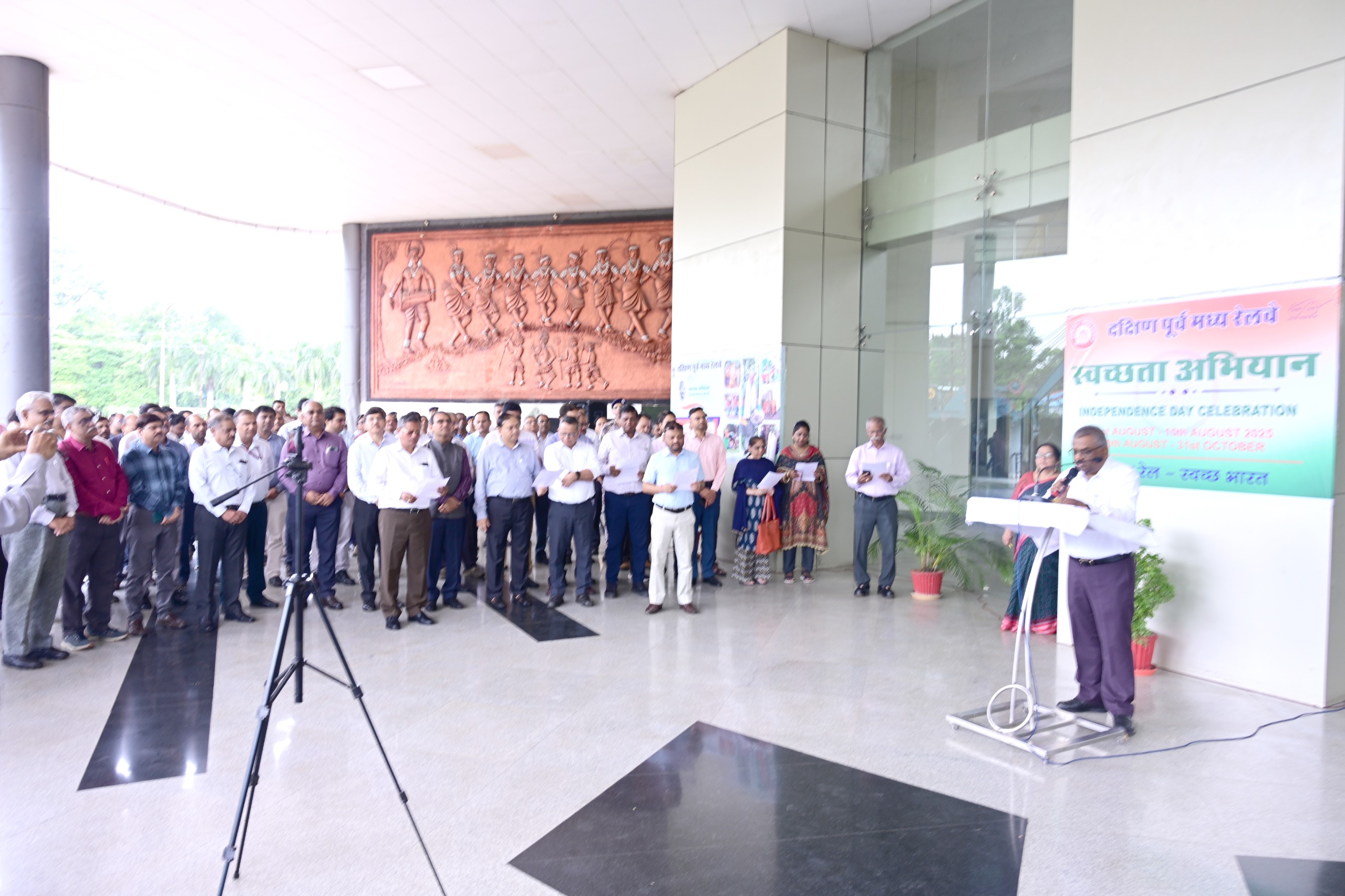 बिलासपुर।भारतीय रेलवे द्वारा स्वच्छ-रेल स्वच्छ-भारत के तहत दिनांक 1 से 15 अगस्त’ तक स्वच्छता-पखवाडा का आयोजन किया जा रहा है । जोनल मुख्यालय में प्रथम दिन आज 1 अगस्त, को दक्षिण पूर्व मध्य रेलवे महाप्रबंधक, श्री तरुण प्रकाश ने सभी विभागाध्यक्ष एवं रेलवे स्टाफ को स्वच्छता-पखवाडा की सामूहिक शपथ दिलाईं गई । इस शपथ समारोह में विभागाध्यक्ष, अधिकारीगण एवं कर्मचारी बड़ी संख्या में उपस्थित थे । ज़ोनल मुख्यालय के साथ साथ तीनों रेल मंडलो में भी स्वच्छता पखवाडा की सामूहिक शपथ दिलाईं गई ।