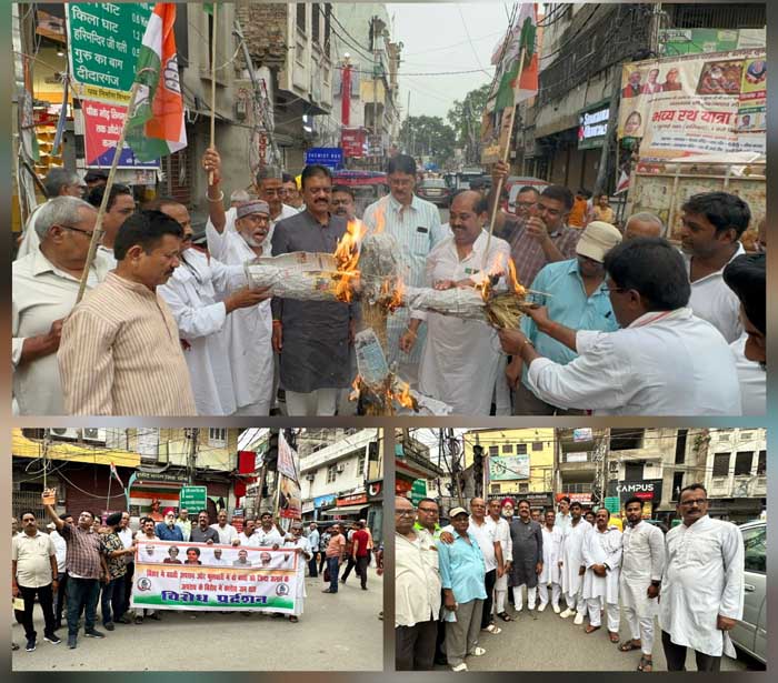 जगदलपुर। कांग्रेस के पूर्व विधायक व एआइसीसी द्वारा नियुक्त बिहार के पर्यवेक्षक रेखचंद जैन के नेतृत्व में शनिवार को पटना के शहीद भगत सिंह चौक में बिहार में कानून-व्यवस्था की बदहाल स्थिति का आरोप लगाकर बिहार के मुख्यमंत्री नितीश कुमार का पुतला फूंका गया।