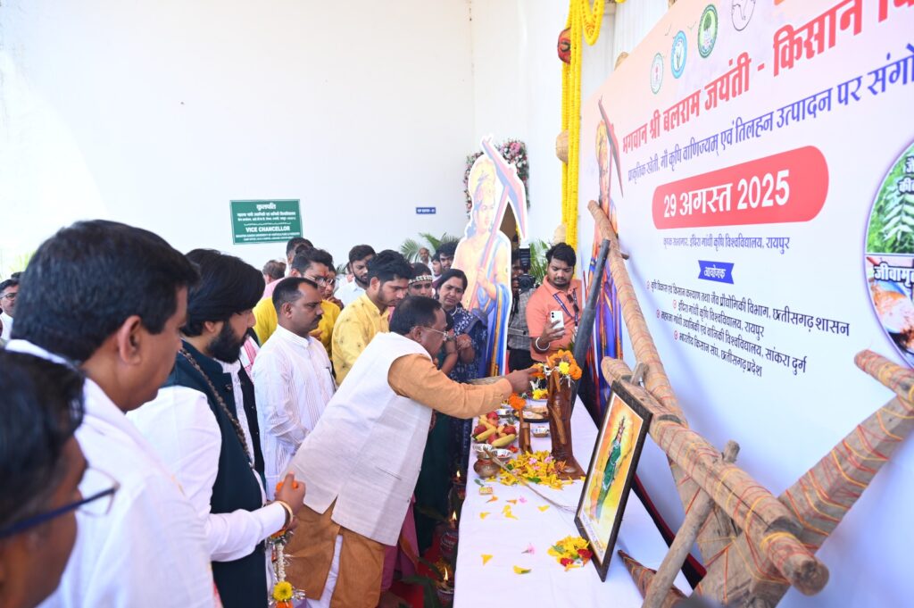 रायपुर। भगवान श्री बलराम जयंती एवं किसान दिवस के उपलक्ष्य में “प्राकृतिक खेती, गौ कृषि वाणिज्य एवं तिलहन उत्पादन” विषय पर एक दिवसीय कृषक संगोष्ठी का आयोजन किया गया। यह कार्यक्रम कृषि विकास एवं कृषक कल्याण विभाग, छत्तीसगढ़ शासन, इंदिरा गांधी कृषि विश्वविद्यालय, रायपुर, महात्मा गांधी उद्यानिकी एवं वानिकी विश्वविद्यालय, सांकरा, पाटन तथा भारतीय किसान संघ, छत्तीसगढ़ प्रदेश के संयुक्त तत्वावधान में आयोजित किया गया। इस संगोष्ठी में रायपुर जिले के विभिन्न ग्रामों से आए कृषक पुरुष एवं महिलाएँ, कृषक संगठन, वैज्ञानिक, छात्र-छात्राएँ तथा कृषि विभाग के अधिकारी सम्मिलित हुए। प्रतिभागियों की संख्या 1500 से अधिक रही। कार्यक्रम के मुख्य अतिथि माननीय कृषि मंत्री श्री रामविचार नेताम एवं माननीय कौशल विकास मंत्री श्री गुरु खुशवंत साहेब थे।