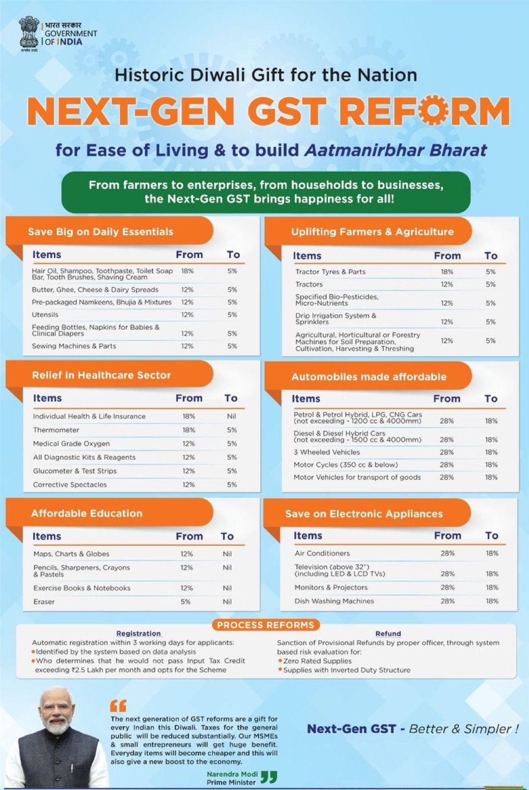 मुख्यमंत्री श्री साय ने कहा कि आयकर में 12 लाख तक की छूट देने के बाद अब जीएसटी दरों में की गई भारी कटौती से रोज़मर्रा की ज़रूरत की वस्तुएं, खेती-किसानी के उपकरण, खाने-पीने की चीज़ें, दवाइयां, शिक्षा सामग्री, मनोरंजन की वस्तुएं, ऑटोमोबाइल और इलेक्ट्रॉनिक उपकरण सस्ते हो गए हैं। कई आवश्यक वस्तुओं पर टैक्स दर शून्य कर दी गई है, जिससे नागरिकों के जीवन में सीधा लाभ पहुंचेगा।