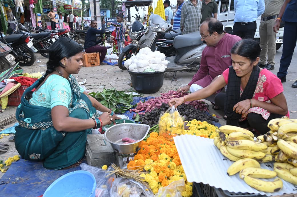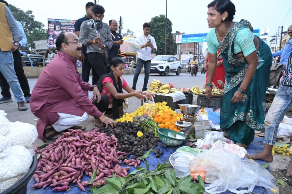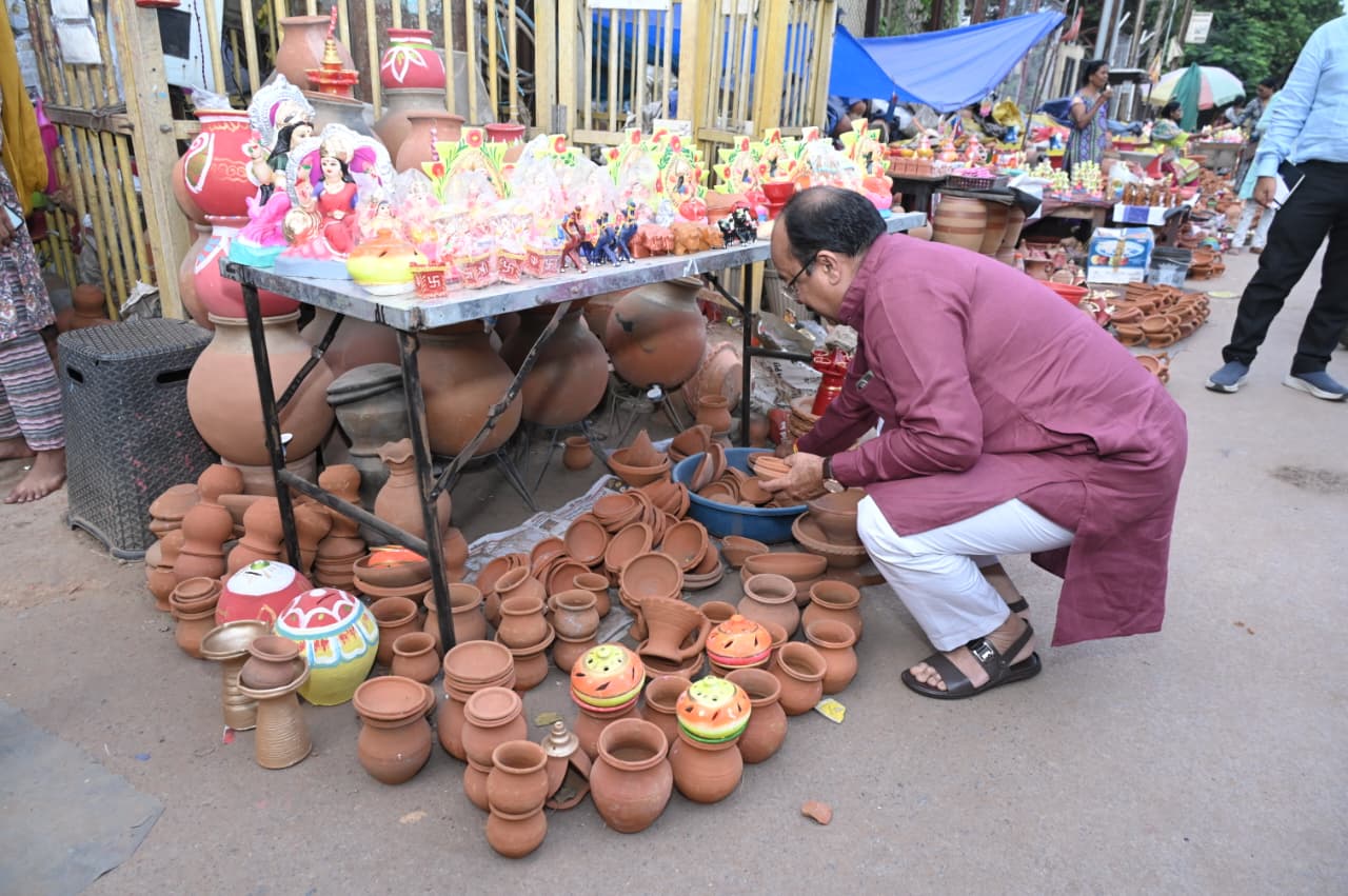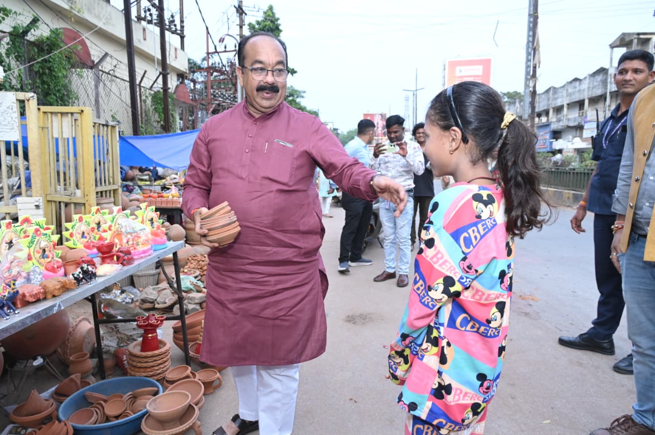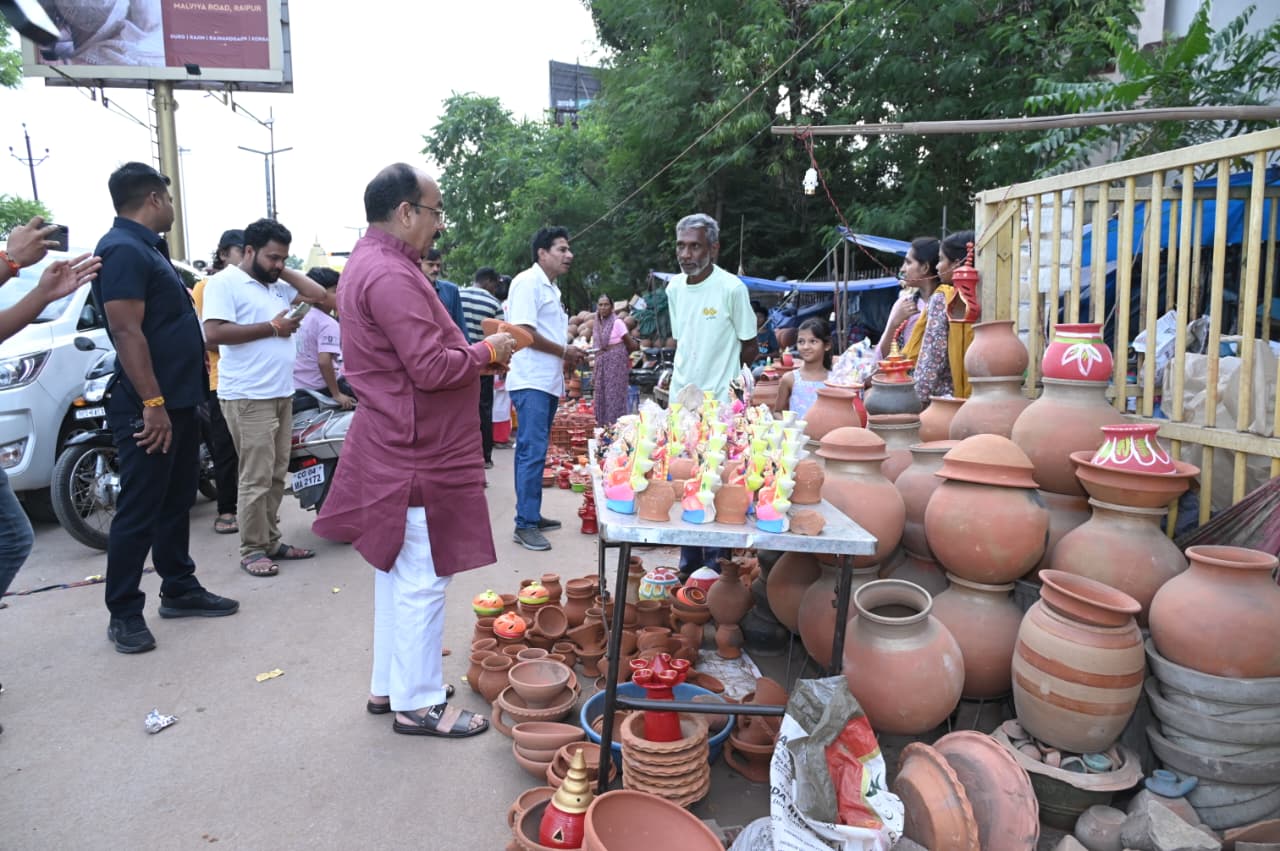उप मुख्यमंत्री श्री साव ने कालीबाड़ी चौक के आसपास बैठे छोटे व्यापारियों से दिए और मूर्ति खरीदे, मिलने आए नन्हें बच्चों को हाथ मिलाकर दीपावली की बधाई दी।टिकरापारा के मुख्य मार्ग में बैठे छोटे व्यापारियों से डिप्टी सीएम साव ने पूजा सामग्री और फल- फूल खरीदे,