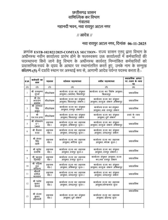 रायपुर। राज्य शासन द्वारा विभाग के अधिनस्थ नवीन कार्यालय प्रारंभ होने के कारण छत्तीसगढ़ के जीएसटी विभाग में कार्यरत 223 बाबुओं को इधर से उधर किया गया है।