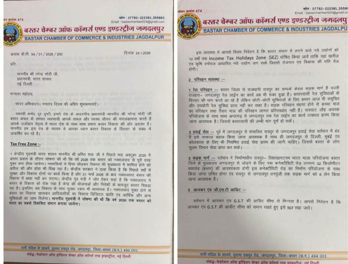 पत्र में यह भी रेखांकित किया गया है किं नक्सलवाद के प्रभाव में लंबे समय तक पिछड़े रहे बस्तर को अब केंद्र सरकार द्वारा नक्सलमुक्त क्षेत्र बनाने की दिशा में निर्णायक कदम उठाए जा रहे हैं। ऐसे में आने वाला समय निवेश और औद्योगिक विकास के लिए निर्णायर्क हो सकता है, बशर्ते बस्तर के आधारभूत ढांचे और टेक्स प्रोत्साहन का वास्तविक लाभ मिले। पत्र के माध्यम से प्रधानमंत्री से अपील की गई है कि बस्तर को कर-मुक्त प्रोत्साहन, मजबूत परिवहन नेटवर्क और समान टेक्स ऑडिट व्यवस्था देकर मुख्यधारा के विकास से जोड़ा जाए, ताकि आदिवासी बहुल इस अंचल में रोजगार, उद्योग और आर्थिक गतिविधियों को नई गति मिल सके। चेंबर ने पत्र में यह भी उल्लेख किया है कि वर्तमान में आयकर और जीएसटी ऑडिट की सीमाएं अलग-अलग हैं, जिससे व्यापारियों पर अतिरिक्त बोझ पड़ रहा है। इसे समान रखते हुए 5 करोड़ रुपए तक करने की मांग की गई है। चेंबर ने उम्मीद जताई है कि केंद्र सरकार की पहल से बस्तर को वर्ष 2030 तक देश का सबसे विकसित संभाग बस्तर को बनाया जा सकता है। टैक्स फ्री जोन, मजबूत कनेक्टिविटी और सरल कर व्यवस्था से बस्तर में उद्योगों का विस्तार होगा और युवाओं को स्थानीय स्तर पर रोजगार मिलेगा।