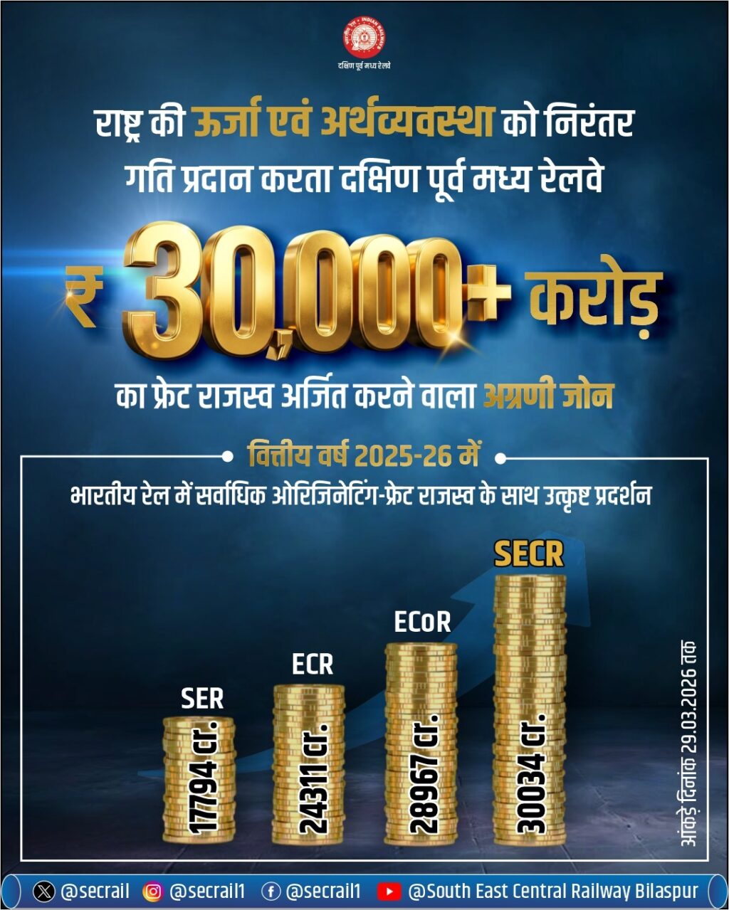 रायपुर/बिलासपुर। देश की ऊर्जा एवं औद्योगिक आपूर्ति श्रृंखला को सुदृढ़ आधार प्रदान करने में अग्रणी भूमिका निभा रहा दक्षिण पूर्व मध्य रेलवे ने वित्तीय वर्ष 2025-26 में एक उल्लेखनीय उपलब्धि हासिल करते हुए ₹30,000 करोड़ से अधिक का ऑरिजिनेटिंग फ्रेट रेवेन्यू अर्जित किया है। यह महत्वपूर्ण उपलब्धि 28 मार्च 2026 को मात्र 362 दिनों में प्राप्त की गई, जो अब तक का सर्वश्रेष्ठ प्रदर्शन है।