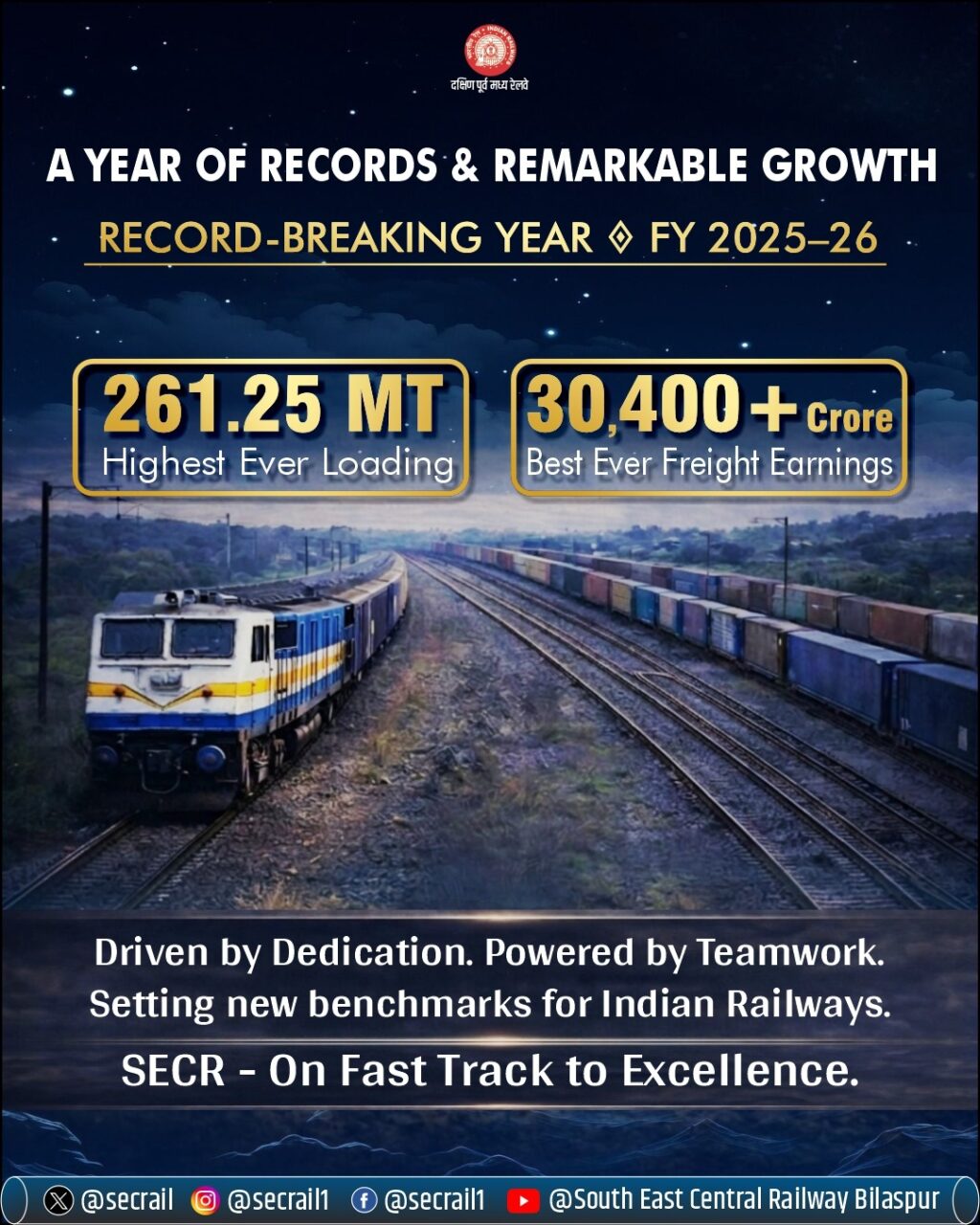 दक्षिण पूर्व मध्य रेलवे ने “समर्पण से प्रेरित, टीम वर्क से सशक्त” की भावना के साथ कार्य करते हुए भारतीय रेल में नए मानक स्थापित किए हैं तथा भविष्य में भी इसी गति से उत्कृष्टता की दिशा में निरंतर अग्रसर रहने के लिए प्रतिबद्ध है।