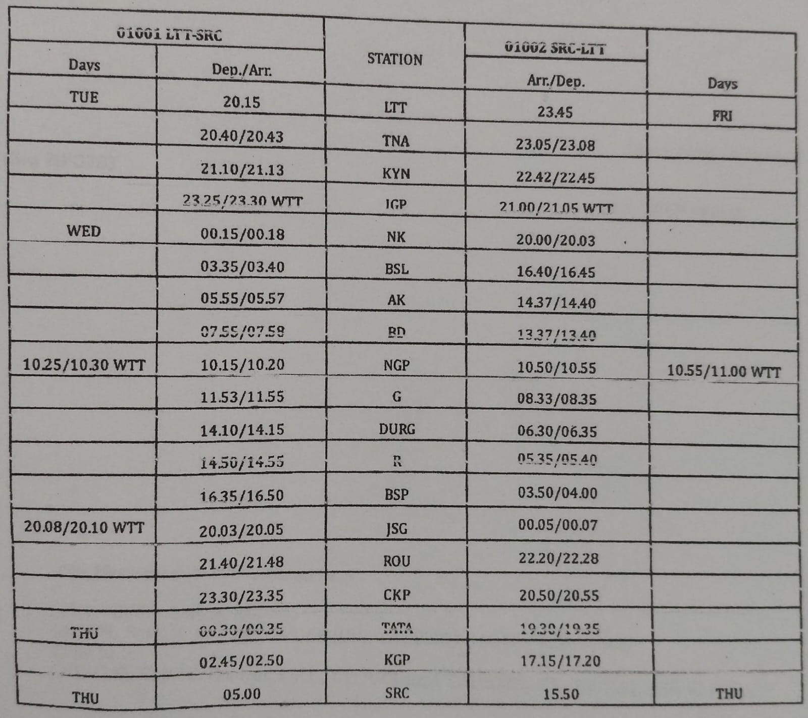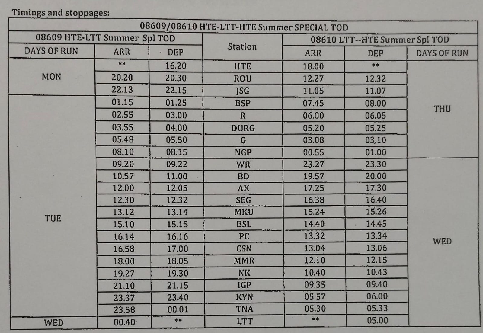 *गाड़ी संख्या 08610 एलटीटी-हटिया स्पेशल ट्रेन एलटीटी से बुधवार को 05.00 बजे रवाना होगी तथा मध्यवर्ती स्टेशनों से होते हुये दूसरे दिन गुरुवार को गोंदिया स्टेशन आगमन 03.08 बजे, प्रस्थान 03.10 बजे, दुर्ग आगमन 05.20 बजे, प्रस्थान 05.25 बजे, रायपुर आगमन 06.00 बजे, प्रस्थान 06.05 बजे, बिलासपुर में आगमन 07.45 बजे, प्रस्थान 08.00 तथा 18.00 बजे हटिया स्टेशन पहुंचेगी ।