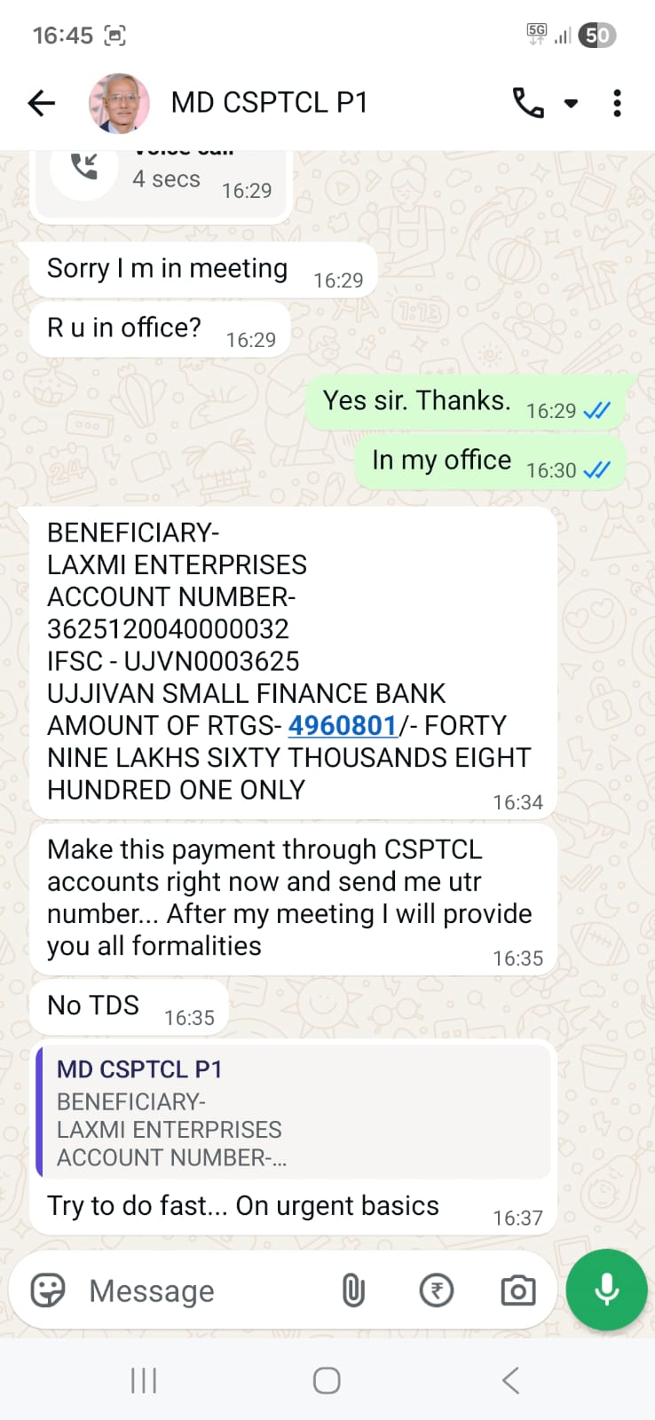 ट्रांसमिशन कंपनी के कुछ अधिकारियों को आज दोपहर में एक फर्जी मोबाइल नंबर 99315-25803 से व्हाट्सएप के माध्यम से संदेश भेजे गए, जिनमें स्वयं को एमडी बताते हुए यह कहा गया कि वे किसी महत्वपूर्ण बैठक में व्यस्त हैं और तत्काल प्रभाव से एक बड़ी राशि 49 लाख 60 हजार 801 आरटीजीएस के माध्यम से एक निर्दिष्ट खाते में स्थानांतरित की जाए। संदेश में जल्दबाजी का माहौल बनाते हुए अधिकारियों पर तुरंत कार्रवाई करने का दबाव भी बनाया गया, जो कि साइबर ठगों द्वारा अपनाई जाने वाली सामान्य रणनीति मानी जाती है। मैसेज में बैंक का नाम, खाता संख्या, आईएफएसई कोड और लाभार्थी के संस्थान का नाम लिखा था। कंपनी के सतर्क अधिकारियों ने इस संदिग्ध संदेश को गंभीरता से लेते हुए इसकी पुष्टि करने का प्रयास किया, जिसके बाद यह स्पष्ट हुआ कि यह पूरा मामला एक सुनियोजित साइबर फ्रॉड है।