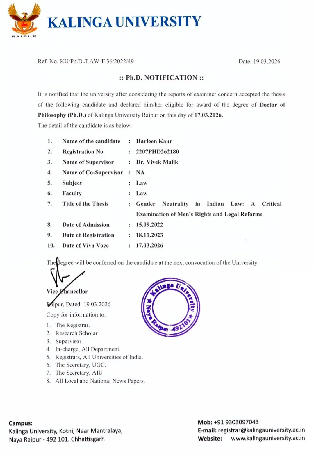 रायपुर। कलिंगा विश्वविद्यालय,नया रायपुर के विधि संकाय की सहायक प्राध्यापक हरलीन कौर को कलिंगा विश्वविद्यालय के द्वारा पीएच.डी. उपाधि से सम्मानित किया गया। उनके शोधकार्य का विषय “जेन्डर न्यूट्रेलिटी इन इंडियन लॉ: ए क्रिटिकल एक्जामिनेशन आफ मेन्स राईटस एंड लीगल रिफार्म्स ” था।उन्होंने अपना शोध कार्य कलिंगा विश्वविद्यालय के प्राध्यापक डॉ. विवेक मलिक के निर्देशन में पूर्ण किया। उनका शोध कार्य विधि और मानवाधिकार के क्षेत्र में महत्वपूर्ण योगदान देने वाला रहा है, जिसे विश्वविद्यालय एवं शोध विद्वानों के द्वारा सराहा गया है।