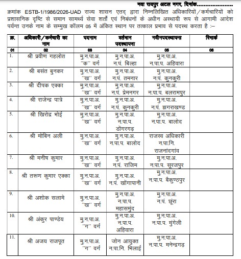 रायपुर। राज्य शासन द्वारा नगरीय प्रशासन एवं विकास विभाग में 37 अधिकारियों-कर्मचारियों के स्थानांतरण किए गए हैं। इनमें मुख्य नगर पालिका अधिकारी, राजस्व अधिकारी, सहायक राजस्व अधिकारी से लेकर राजस्व निरीक्षक, राजस्व उप निरीक्षक, सहायक राजस्व निरीक्षक, लेखापाल और सहायक ग्रेड-2 तक के अधिकारी-कर्मचारी शामिल हैं।