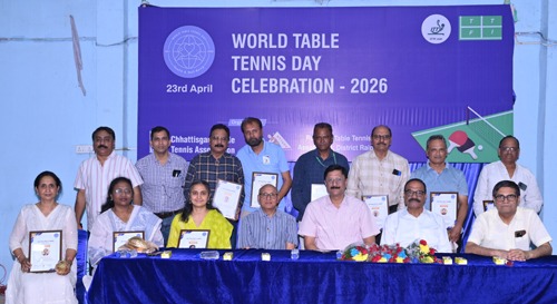 रायपुर। वर्ल्ड टेबल टेनिस डे (23 अप्रैल) के उपलक्ष्य में छत्तीसगढ़ टेबल टेनिस संघ एवं राजधानी टेबल टेनिस संघ, रायपुर के संयुक्त तत्वावधान में कल सप्रे शाला टेबल टेनिस हॉल, रायपुर में एक गरिमामय समारोह का आयोजन किया गया। इस अवसर पर टेबल टेनिस के साथ-साथ अन्य खेलों में भी उत्कृष्ट योगदान देने वाले वरिष्ठ खिलाडिय़ों को सम्मानित किया गया। समारोह के मुख्य अतिथि रायपुर के प्रथम पुलिस कमिश्नर संजीव शुक्ला (आईपीएस) थे। कार्यक्रम की अध्यक्षता छत्तीसगढ़ ओलंपिक संघ के उपाध्यक्ष श्री शरद शुक्ला जी ने किया तथा विशेष अतिथि छत्तीसगढ़ टेबल टेनिस संघ के वरिष्ठ उपाध्यक्ष श्री किशोर जादवानी जी एवं पूर्व संरक्षक डॉ. भरत अग्रवाल जी थे। संघ के उपाध्यक्ष श्री विनय बैसवाडे भी मंच पर मौजूद थे। कार्यक्रम का संचालन रायपुर महानगर टेबल टेनिस संघ के सचिव श्री शकील साजिद ने किया। इस अवसर पर खिलाडय़ों को सम्मानित किया गय।