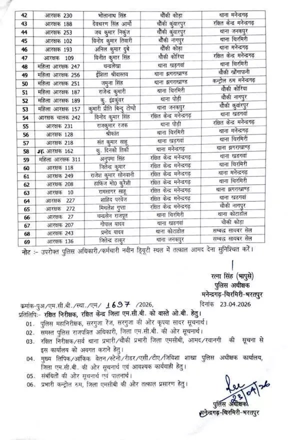 मनेंद्रगढ़-चिरमिरी-भरतपुर। जिले में एसपी रतना सिंह ने प्रशासनिक कसावट के तहत 69 पुलिस कर्मियों के तबादले के आदेश जारी किए हैं। जिनमें 4 सहायक उप निरीक्षक, 13 प्रधान आरक्षक और 52 आरक्षक शामिल हैं। इन सभी को जिले के विभिन्न थानों और पुलिस इकाइयों में नई पदस्थापना दी गई है, ताकि प्रशासनिक कार्यप्रणाली को और अधिक प्रभावी बनाया जा सके।