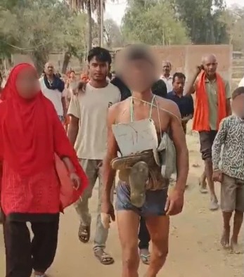 चोरी के संदेह में ग्रामीणों ने अर्धनग्न कर पत्नी के साथ जूते-चप्पलों की माला पहनाकर पस्ता गांव में घुमाया
