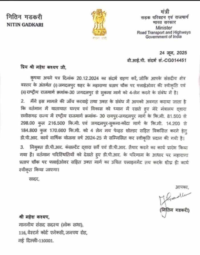 जगदलपुर। बस्तर सांसद महेश कश्यप ने 20 दिसंबर 2024 को केंद्रीय परिवहन मंत्री नितिन गडकरी को पत्र लिखकर जगदलपुर शहर...