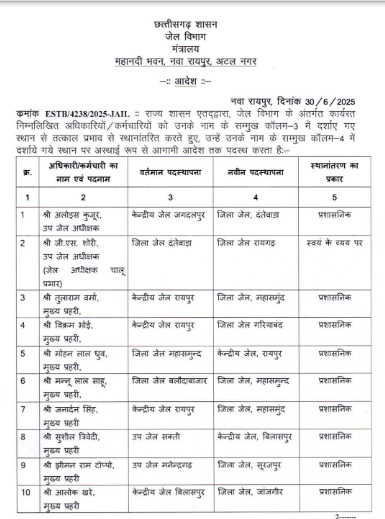 रायपुर। छत्तीसगढ़ शासन के जेल विभाग ने 47 अफसरों का तत्काल प्रभाव से स्थानांतरण कर दिया है। जिला जेल महासमुंद...