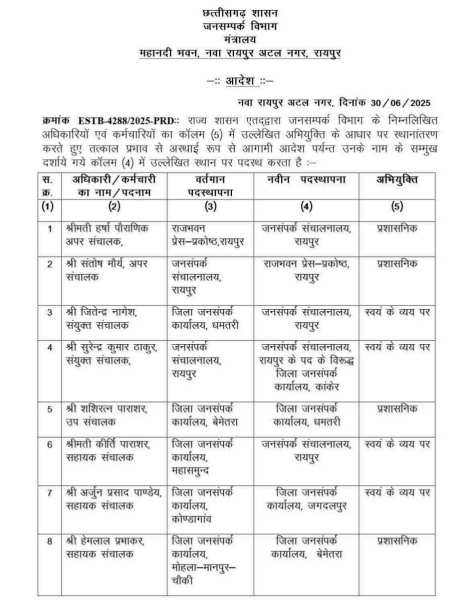रायपुर। राज्य सरकार ने छत्तीसगढ़ जनसंपर्क विभाग में 39 अधिकारी और कर्मचारियों का तबादला कर दिया है। वहीं जनसंपर्क संचालनालय...