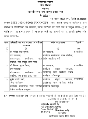 रायपुर। वित्त विभाग ने तीन उप संचालक सहित 17 वित्त एवं लेखाधिकारियों के तबादले कर दिए है।