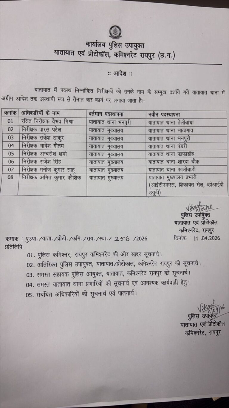 रायपुर। यातायात एवं प्रोटोकॉल, रायपुर के पुलिस उपायुक्त द्वारा जारी आदेश के तहत आठ निरीक्षकों को अस्थायी रूप से विभिन्न...
